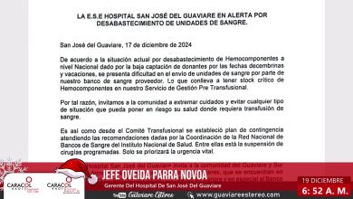 Hospital San José del Guaviare alerta sobre desabastecimiento crítico de hemocomponentes