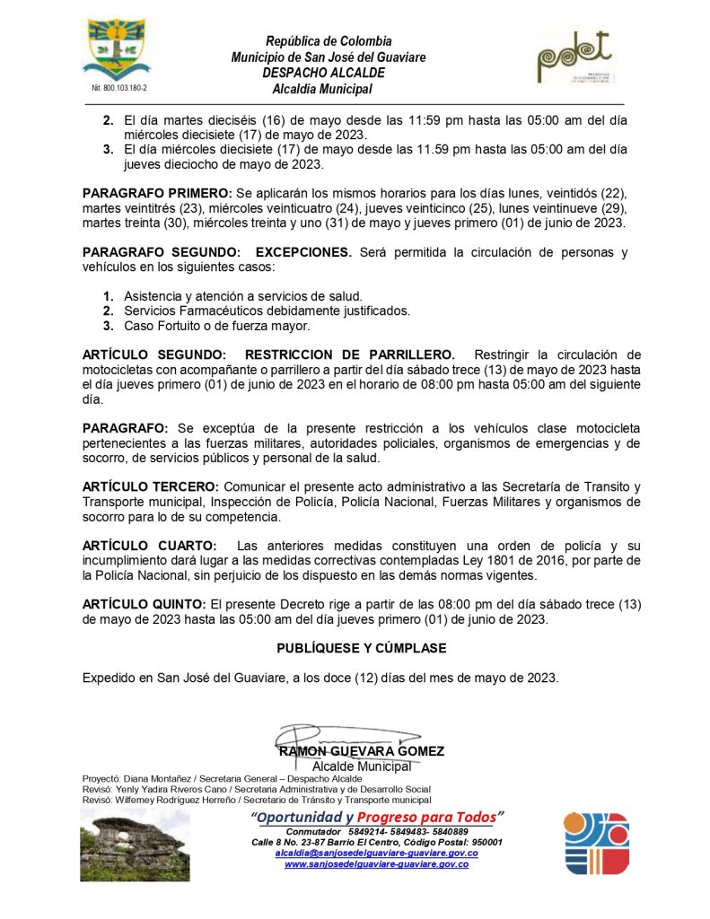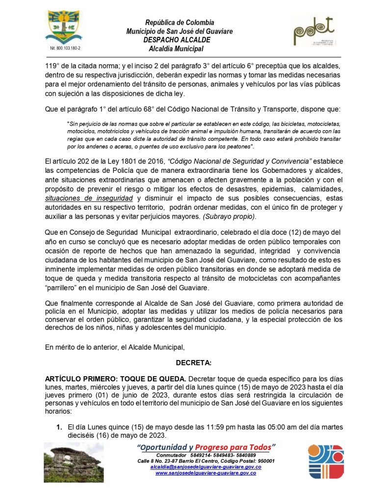 El toque de queda regirá desdés hoy 15 de mayo y va hasta el primero de junio de este año. La medida tendrá vigencia los días lunes, martes, miércoles y jueves, a partir del día lunes quince de mayo de 2023 hasta el día jueves primero (01) de junio de 2023.