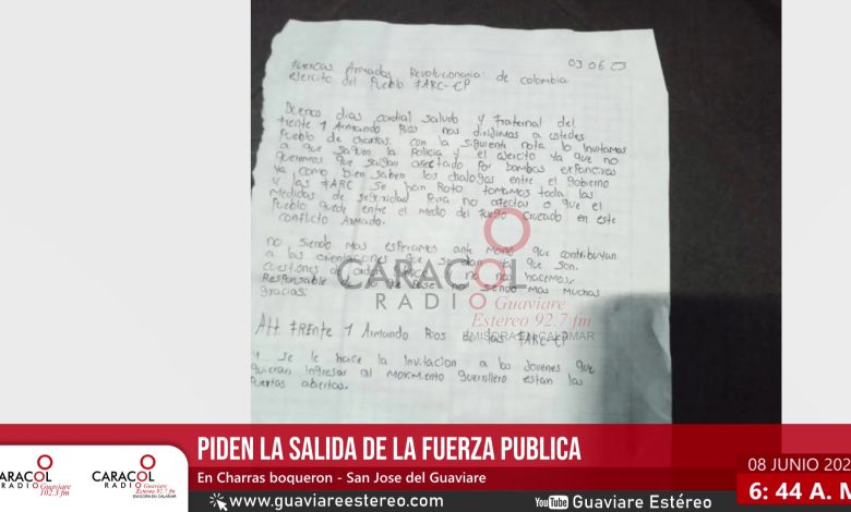 Como algo de no creer, el frente Primero de las disidencias de las FARC, por medio de una carta dieron la orden a la comunidad que saquen a la Policía y el Ejército del corregimiento de Charras – Boquerón, de San José del Guaviare, para evitar que la población civil resulte afectada en medio del fuego.