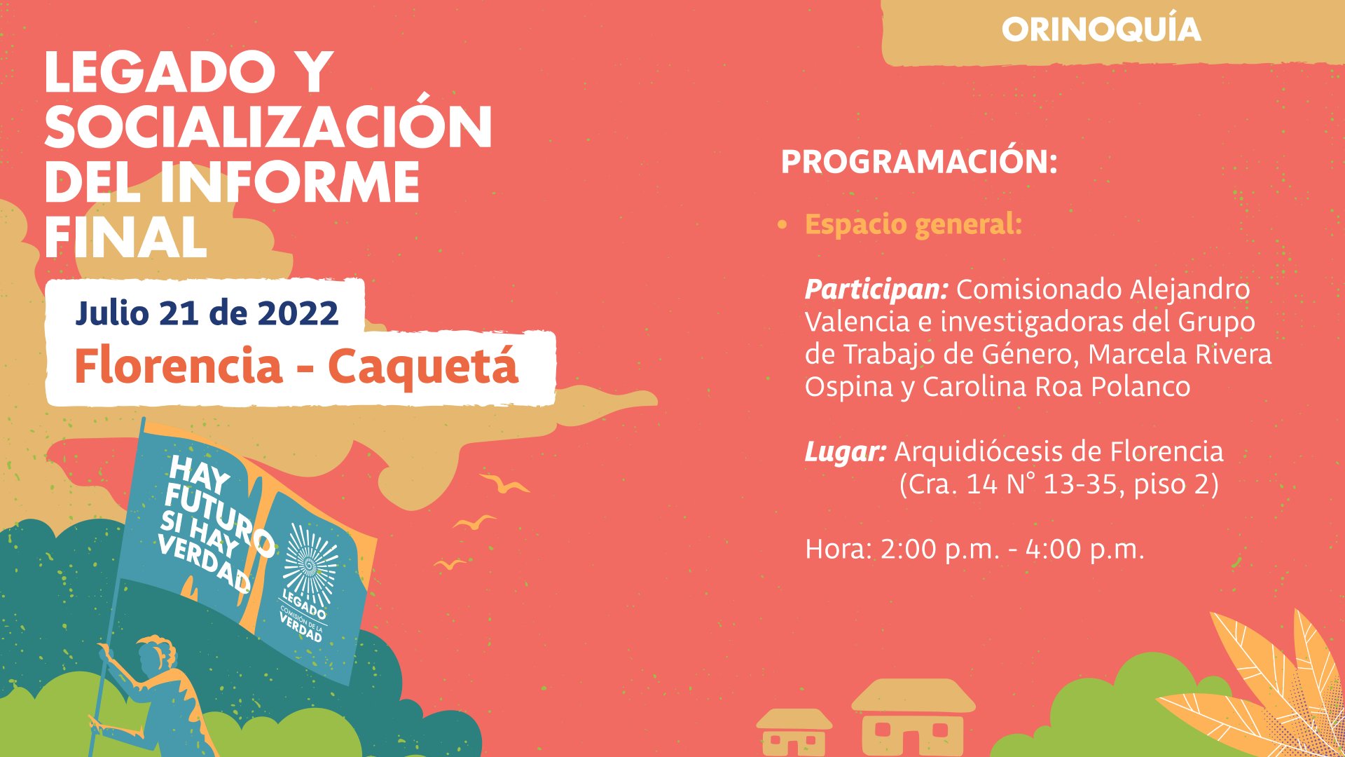 La gira inició ayer lunes 18 de julio en San José del Guaviare y termina el 23 en Florencia, Caquetá tras tener encuentros, conversatorios y foros en San José del Guaviare, Villavicencio y Florencia. Este recorrido por los distintos territorios de la región tiene como propósito socializar los capítulos del Informe Final que esclarecen las causas del conflicto armado colombiano, los impactos, afrontamientos y resistencias de los diversos sectores y actores para, con ello, dar a conocer las recomendaciones para la no repetición.