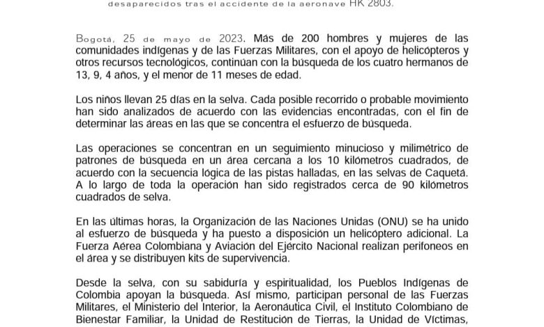 Las Naciones Unidas se agregó a las entidades en Guaviare en las actividades de búsqueda de los cuatro menores que viajaban en una avioneta que se accidentó el pasado 1 de mayo en la selva amazónica y que por el momento siguen desaparecidos.