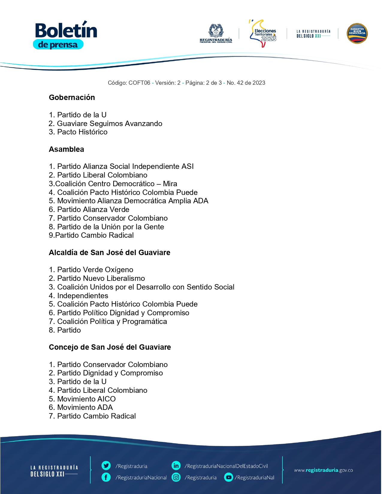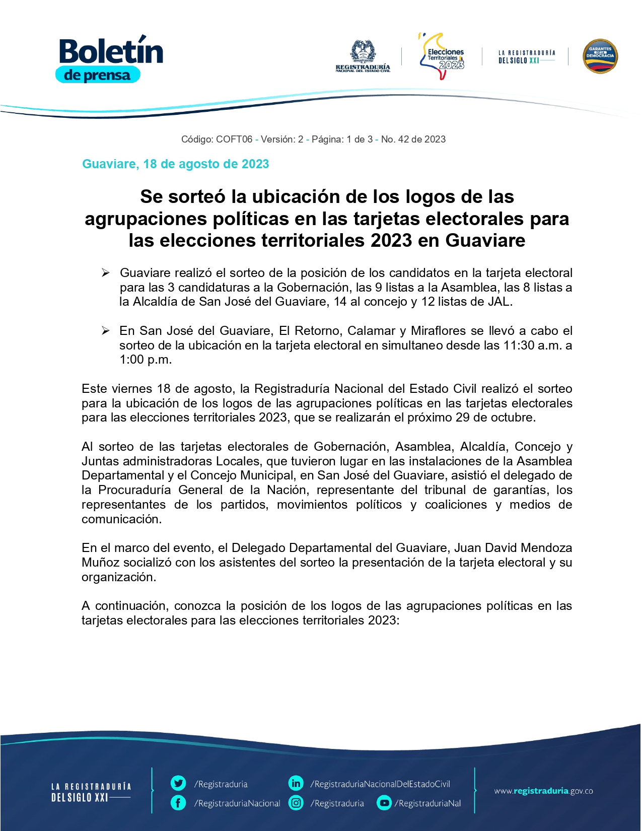 Se realizó el sorteo de la posición de los candidatos en la tarjeta electoral para las 3 candidaturas a la Gobernación, las 9 listas a la Asamblea, las 8 listas a la Alcaldía de San José del Guaviare, 14 al concejo y 12 listas de JAL.
