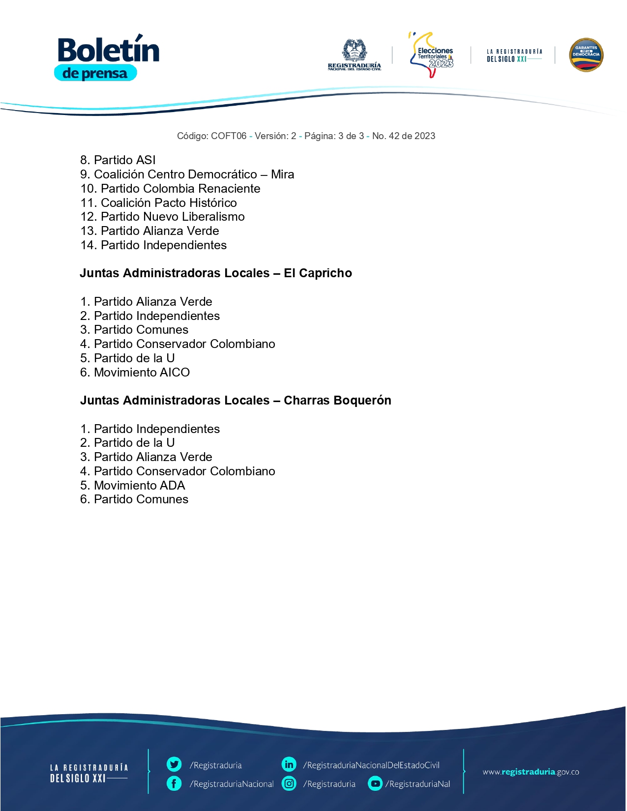 La posición de los logos de las agrupaciones políticas en las tarjetas electorales para las elecciones territoriales 2023 quedó de la siguiente manera:
