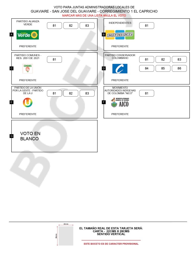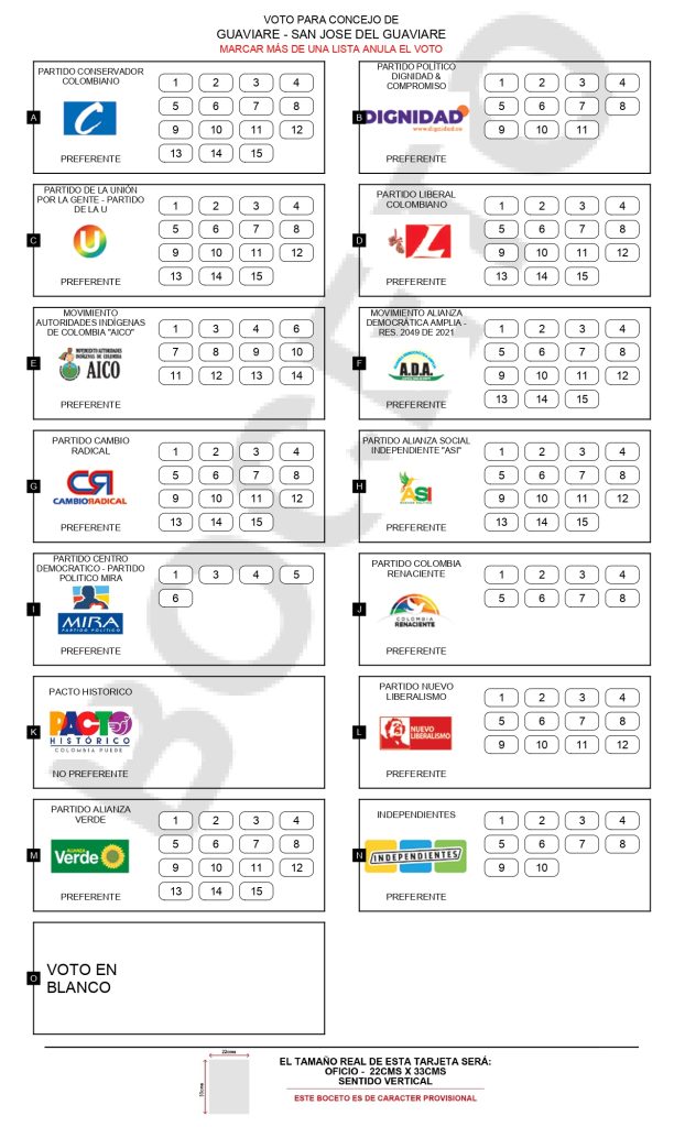 En la casilla Uno: Partido de la U, Alexander García, Dos: Guaviare Seguimos Avanzando: Yeison Rojas y Tres: Pacto Histórico: German Olarte.
